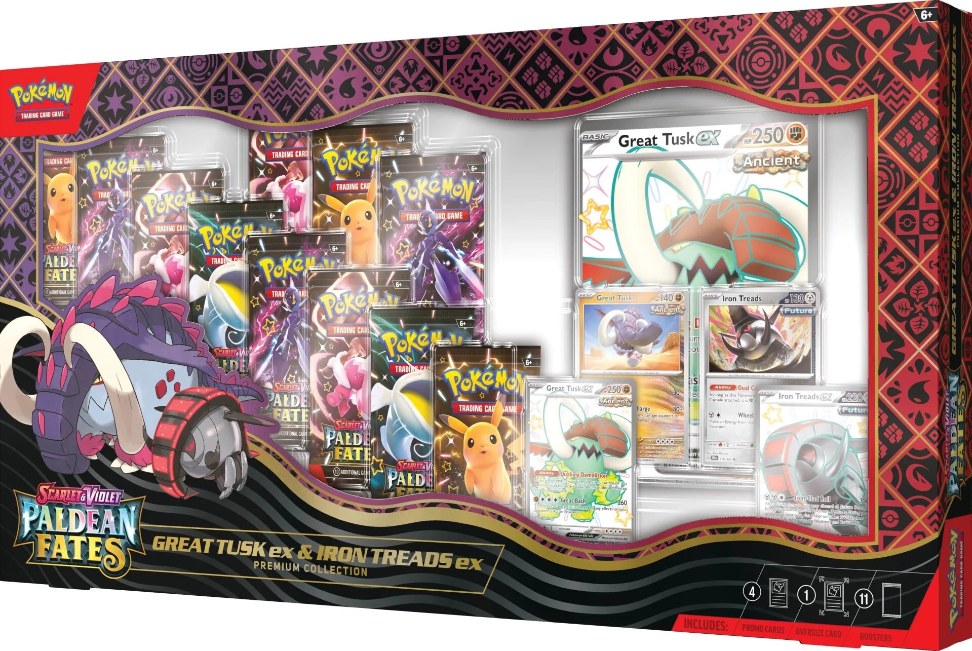 The Pokémon TCG: Great Tusk ex & Iron Treads ex Premium Collection includes: